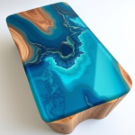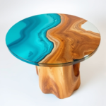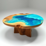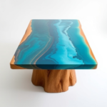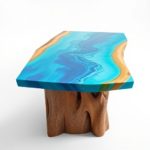 A stunning resin table featuring a live-edge wooden base and vibrant ocean-inspired colors, blending modern style with natural beauty.